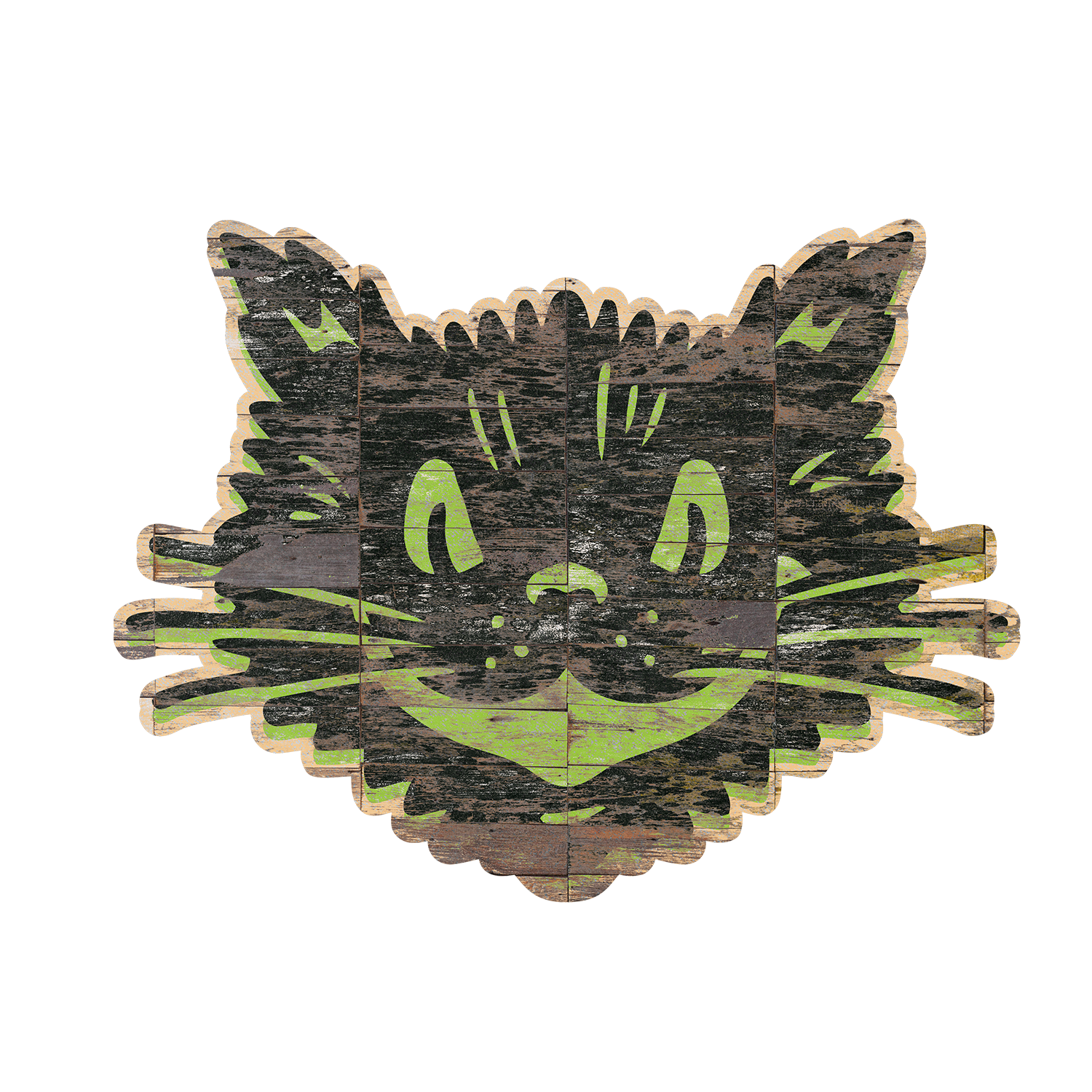 David lifted this graphical style cat from the stylings of old Dennison Co Halloween decorations. He then transformed the graphic into a beat up wood panel complete with peeling paint!