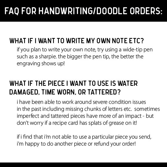 - Handwriting/Recipe Card Recreation: You provide a picture of a treasured recipe card, love note, greeting card signature, etc and we’ll trace it and engrave it on your selected serving board. You can write your own note to be given to loved ones too! Please provide a picture of your recipe card from “straight on” - this helps us capture the handwriting in all the proper angles as to not distort your loved one’s writing.