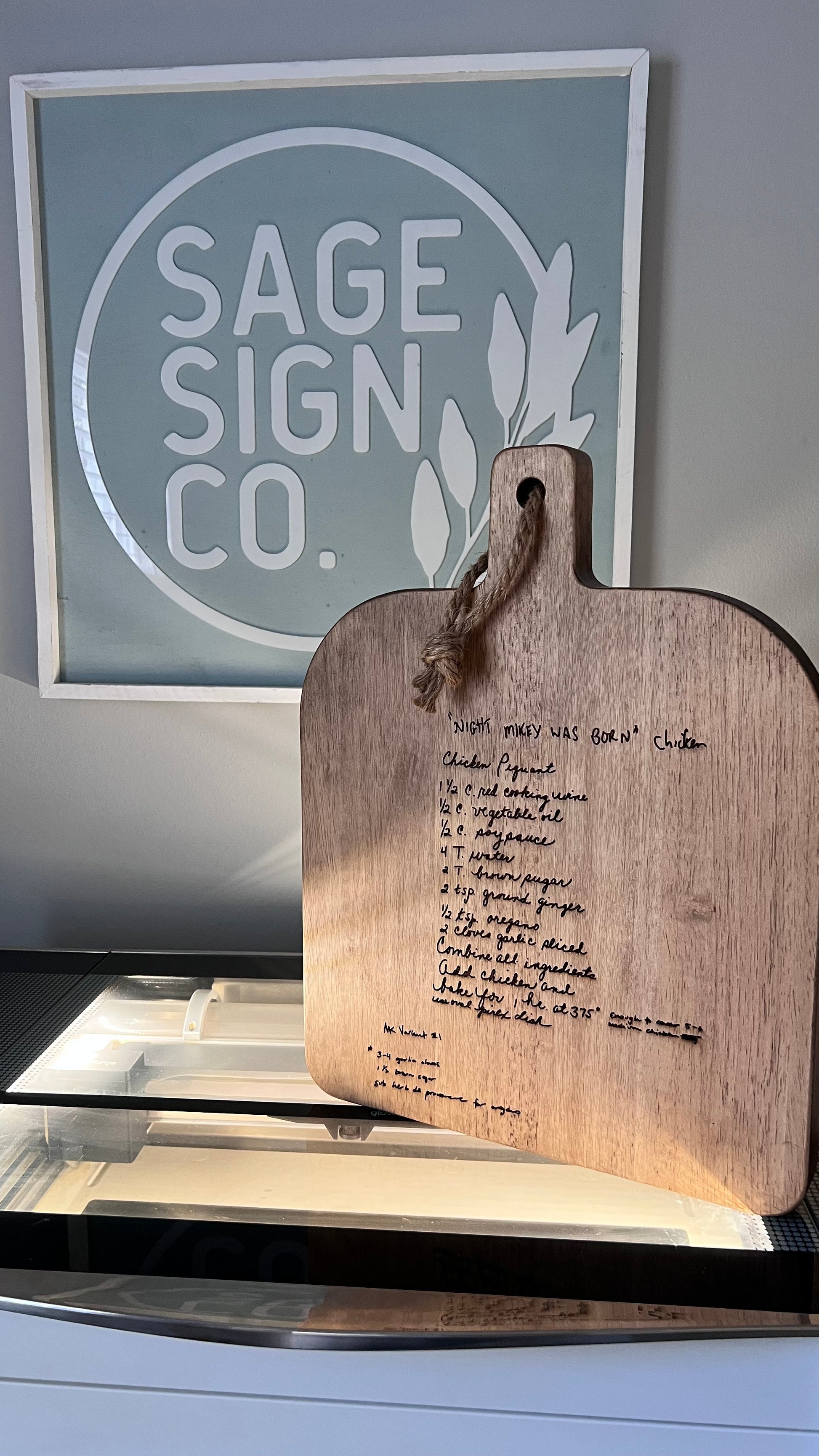 - Handwriting/Recipe Card Recreation: You provide a picture of a treasured recipe card, love note, greeting card signature, etc and we’ll trace it and engrave it on your selected serving board. You can write your own note to be given to loved ones too! Please provide a picture of your recipe card from “straight on” - this helps us capture the handwriting in all the proper angles as to not distort your loved one’s writing.