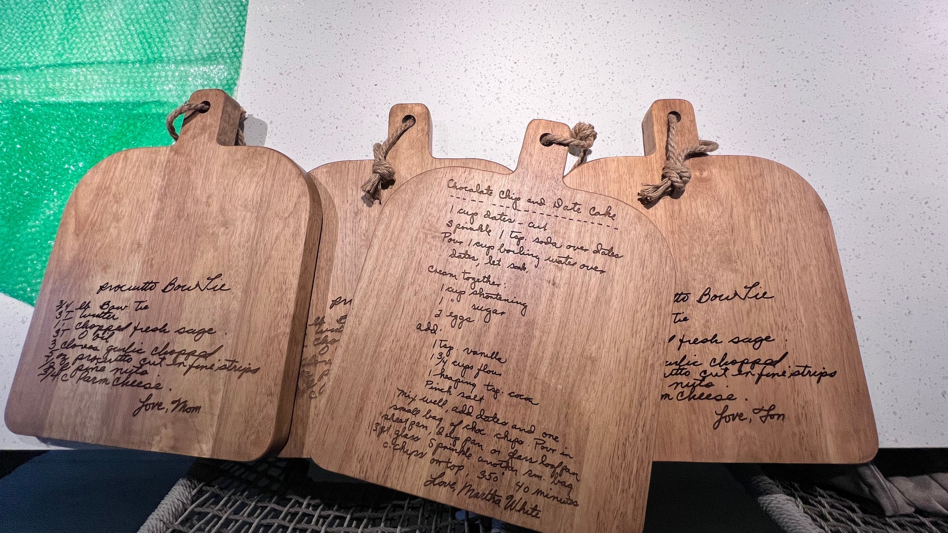 - Handwriting/Recipe Card Recreation: You provide a picture of a treasured recipe card, love note, greeting card signature, etc and we’ll trace it and engrave it on your selected serving board. You can write your own note to be given to loved ones too! Please provide a picture of your recipe card from “straight on” - this helps us capture the handwriting in all the proper angles as to not distort your loved one’s writing.