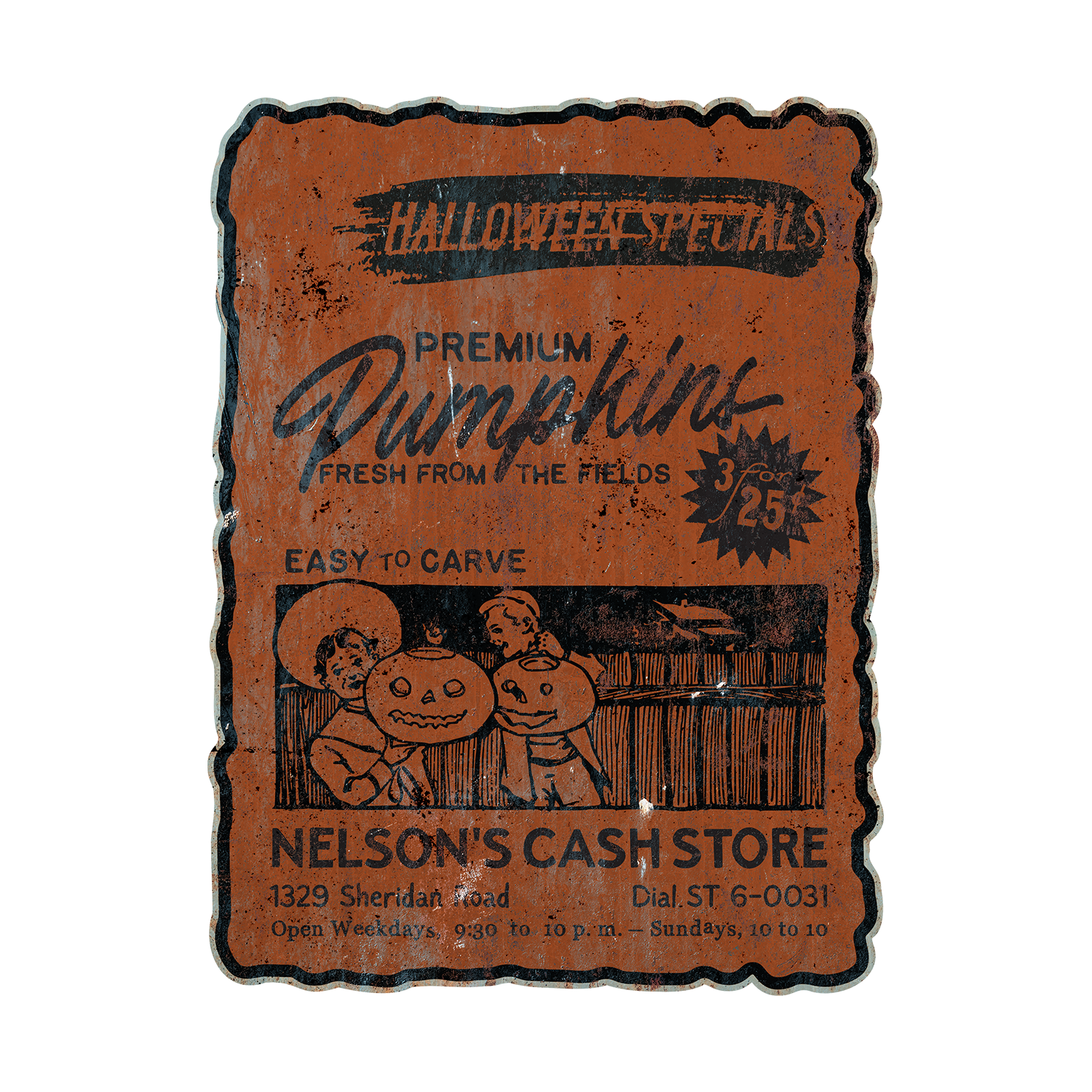 David hand traced a very old Halloween graphic from 1920 and transformed the drawing into a fully realized vintage advertisement for a grocer's special sale on pumpkins! The business is fake but the details on this sign are VERY real!