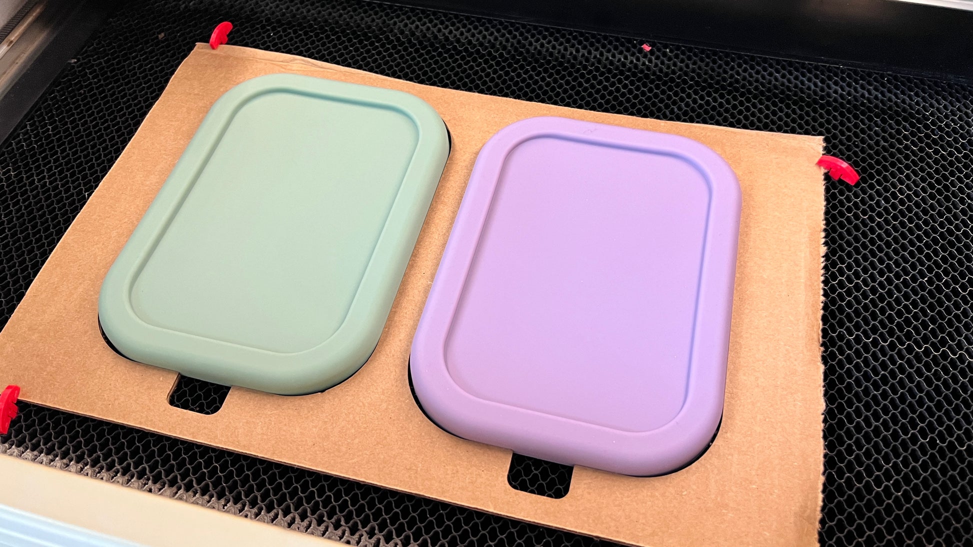See product image for designs included in this bundle. This file contains a SINGLE jig for eight (two rows of 4) lids of the silicone bento box sold by KW Laser Supplies 2. This file contains no physical products and only contains the file described in the title. Real-life photos of the bento lids in the jig are for demonstration/illustrative purposes only.